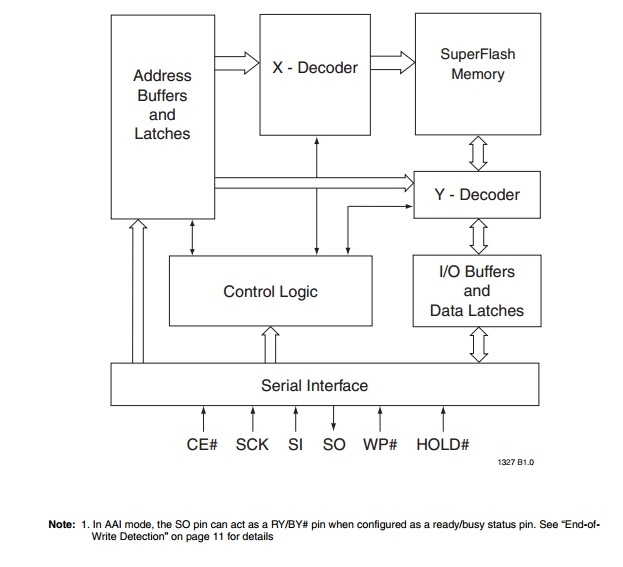 The SST25VF032B features: (1) Single Voltage Read and Write Operations: 2.7V to 3.6V; (2) Serial Interface Architecture: SPI Compatible: Mode 0 and Mode 3; (3) High Speed Clock Frequency: 8MHz Max; (4) Superior Reliability Endurance 100,000 Cycles (typical) : Greater than 100 years Data Retention; (5) Low Power Consumption Active Read Current: 10 mA (typical) Standby Current: 5 uA (typical) ; (6) Flexible Erase Capability: Uniform 4 KByte sectors, Uniform 32 KByte overlay blocks, Uniform 64 KByte overlay blocks; (7) Fast Erase and Byte-Program: Chip-Erase Time: 35 ms (typical) , Sector-/Block-Erase Time: 18 ms (typical), Byte-Program Time: 7 μs (typical) ; (8) Auto Address Increment (AAI) Word Programming: Decrease total chip programming time over Byte-Program operations; (9) End-of-Write Detection: Software polling the BUSY bit in Status Register, Busy Status readout on SO pin; (10) Hold Pin (HOLD#) : Suspends a serial sequence to the memory without deselecting the device; (11) Write Protection (WP#) : Enables/Disables the Lock-Down function of the status register.